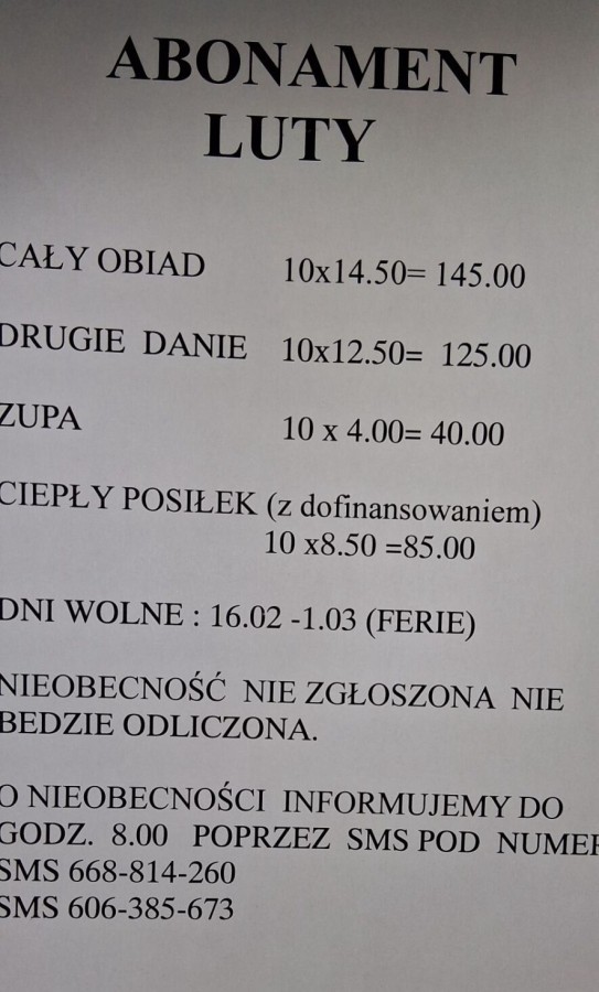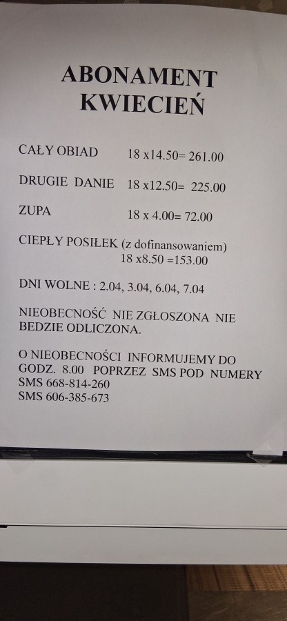- Ciepły posiłek jednodaniowy (np.: zupa z wkładką, danie jednogarnkowe): 8,50 zł w (przypadku tego posiłku jest to jedynie koszt „wsadu do kotła”, pozostałe koszty finansuje Organ Prowadzący).