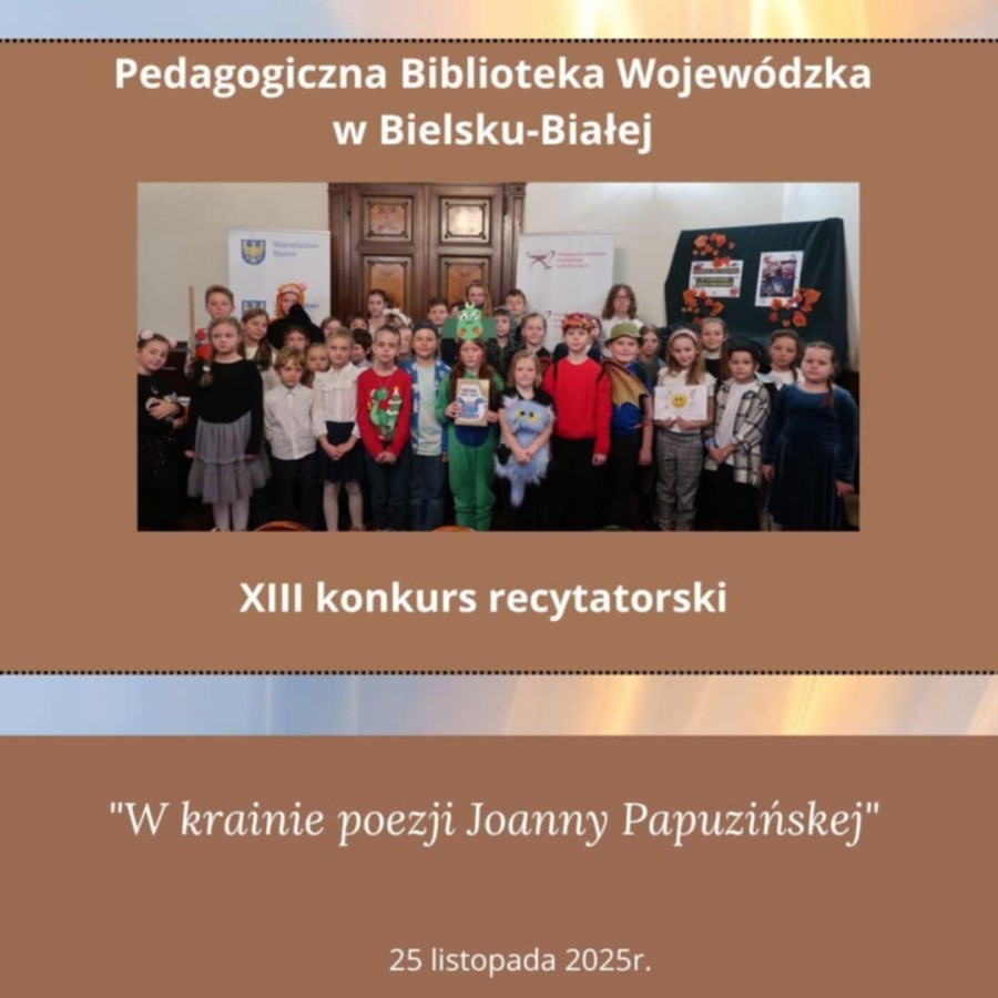 25 listopada 2025r. w Pedagogicznej Bibliotece Wojewódzkiej w Bielsku-Białej wzięliśmy udział w konkursie recytatorskim „W krainie poezji Joanny Papuzińskiej”. Naszą szkołę reprezentowali laureaci szkolnego konkursu recytatorskiego: Zuzanna Waluś z klasy 3b i Michał Kosek z klasy 6a.